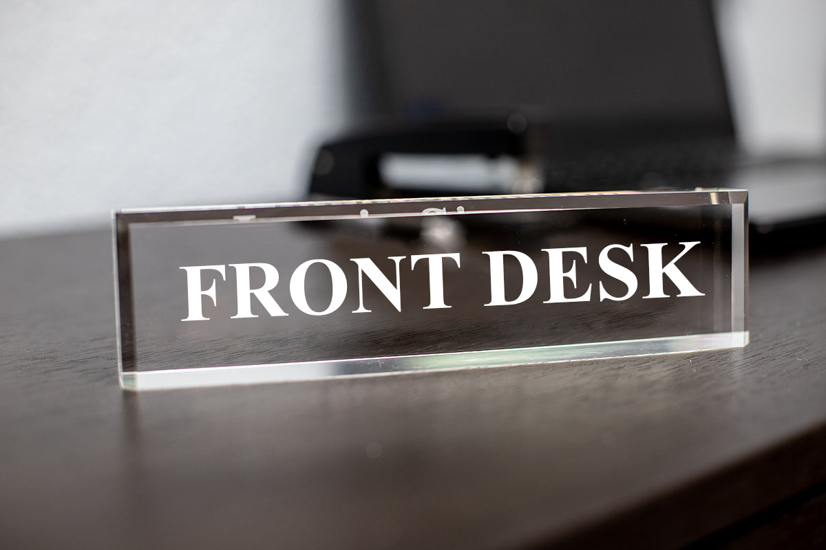 These novelty personalized acrylic desk name plates are the perfect gift for you, your office buddy, boss, new employees or those with a recent promotion. 2" x 8" Clear or Black or Frosted personalized name plate made out of a premium solid acrylic block, expertly lazer engraved with text, great office gift. Provide clear communication to your employees, customers and clients. The desk signs are great for offices, hospitality venues, customer waiting rooms and more.