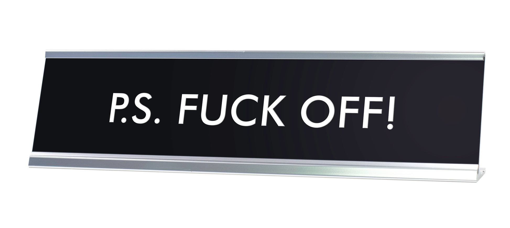 Novelty Desk Plate sign for the at home or work. The name plate is black with white lettering. Plate slides into a silver aluminum desk holder.