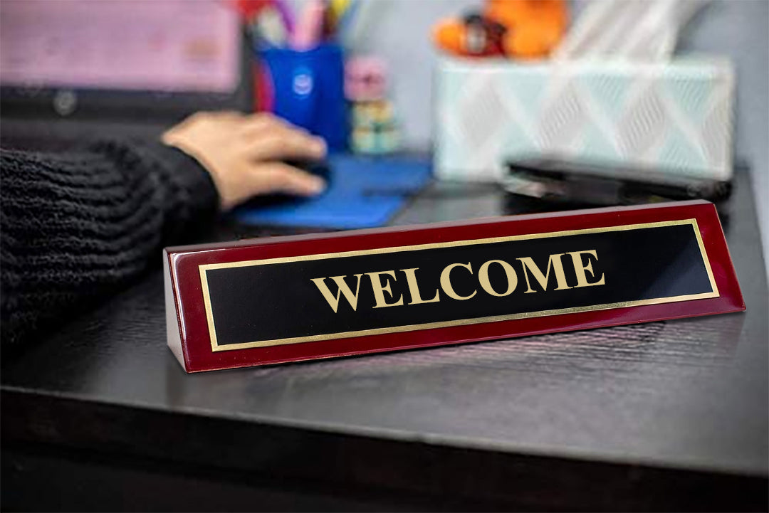 Piano Finished Rosewood Standard Engraved Desk Name Plate 'Welcome', 2" x 8", Black/Gold Plate