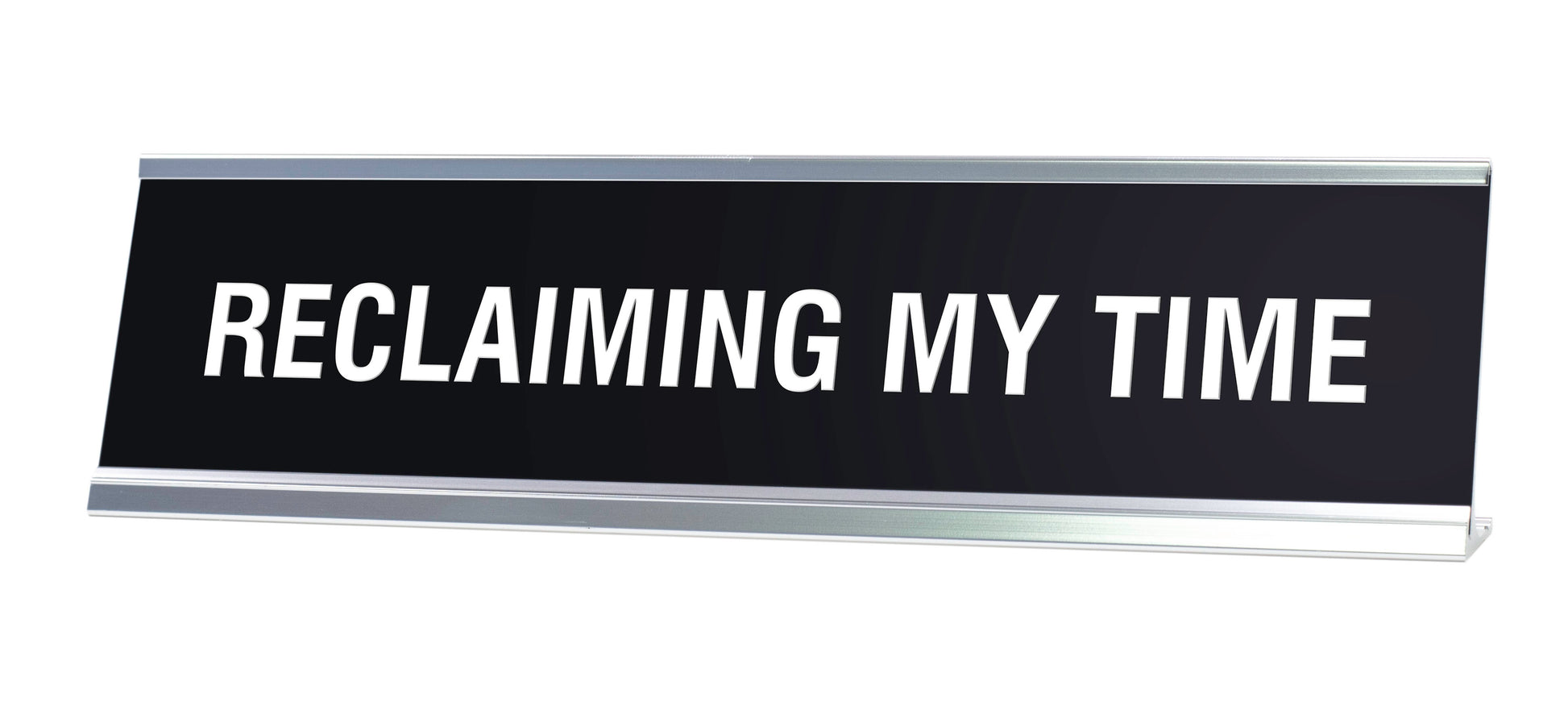 Novelty Desk Plate sign for the at home or work. The name plate is black with white lettering. Plate slides into a silver aluminum desk holder.