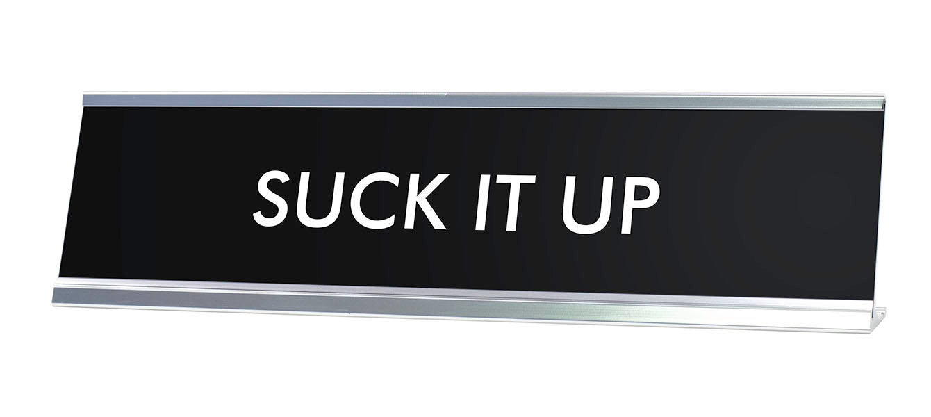Novelty Desk Plate sign for the at home or work. The name plate is black with white lettering. Plate slides into a silver aluminum desk holder.